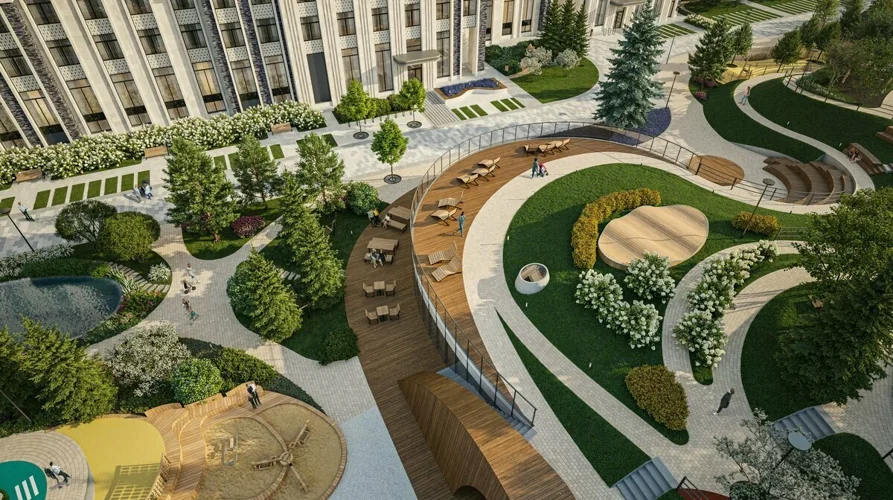 Собственный ландшафтный двор площадью более 1,7 га спроектирован как живописная долина с цветущими кустарниками, взрослыми деревьями, благоухающими луговыми травами, дорожками и мягкой вечерней подсветкой. Скрытая от шума улиц, машин и посторонних людей, территория зеленого оазиса разделена на зоны для спокойного и активного отдыха.