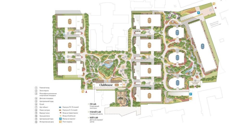 соснами и зонами отдыха у воды; Clubhouse - инфраструктурный центр только для