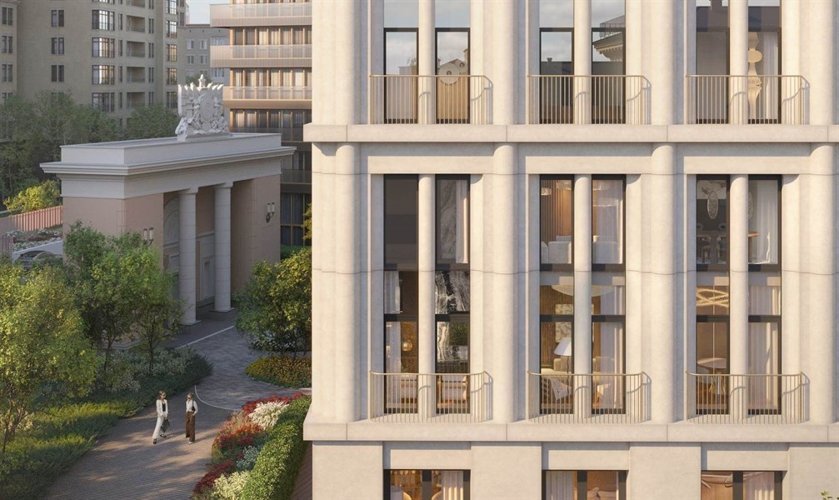 ампир с видами на набережную и трёх стеклянных башен, выполненных в современном