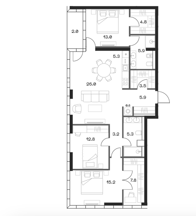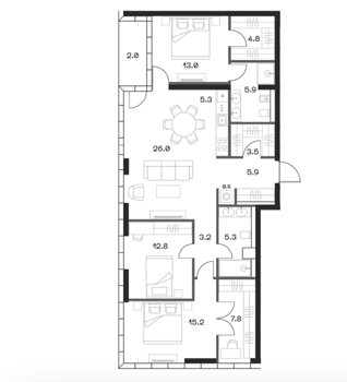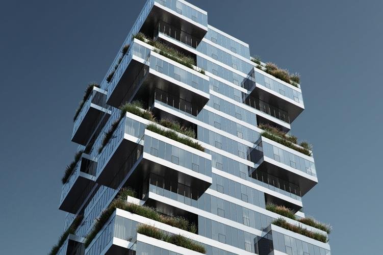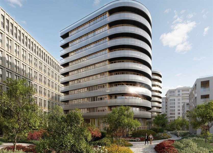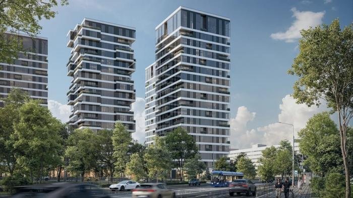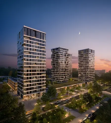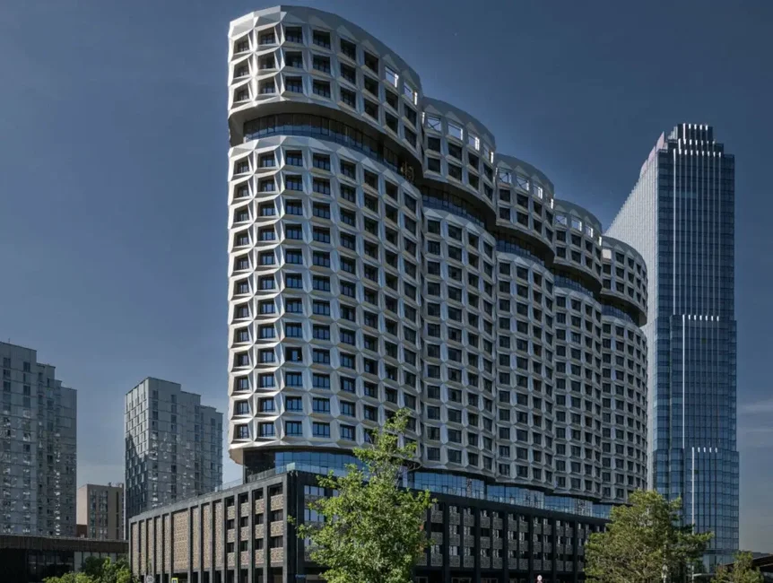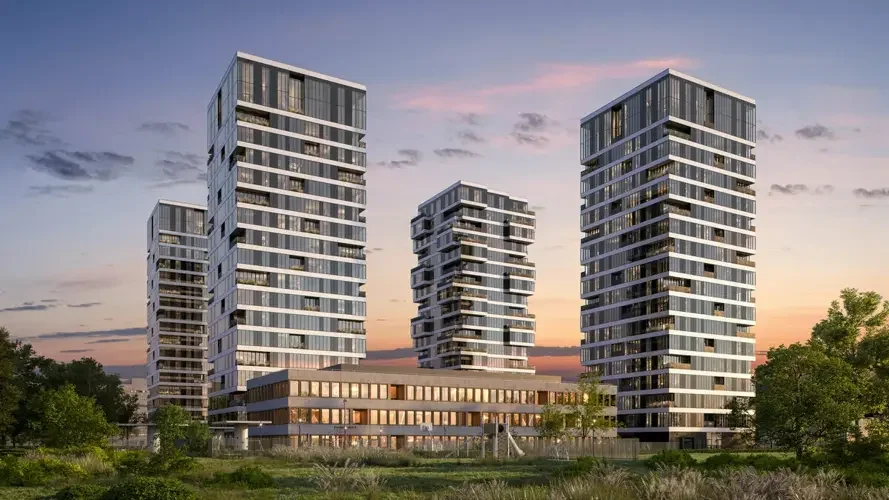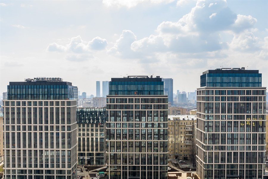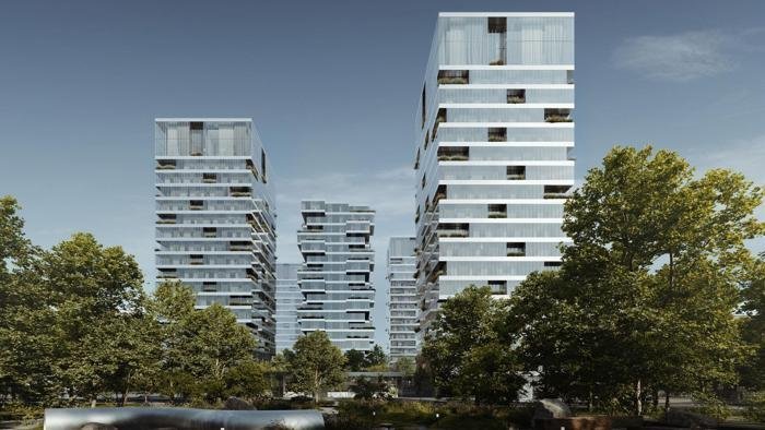 Основана на модульном принципе. Квартал состоит из пяти башен — четыре расположены по углам участка, а пятая находится в центре территории.