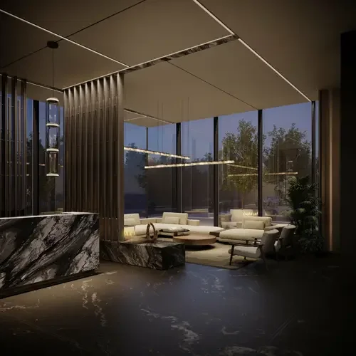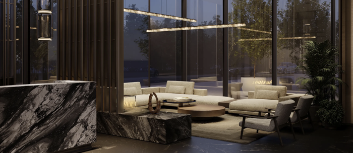 Дизайн лобби для каждой из пяти башен разработан бюро из Южной Кореи WGNB, а адаптирован российской командой Syntaxis. Интерьеры будут в обрамлении панорамных окон, с первых этажей откроются виды на внутренний сад проекта
