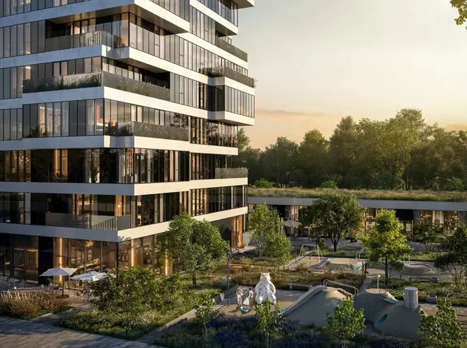 Ландшафтный парк. Значительную часть участка 2,47 га займёт парк, где высадят много цветов и деревьев, установят малые архитектурные формы — каменные кресла, скамейки и кашпо. Пешеходные дорожки внутреннего двора вымостят брусчаткой из гранита.